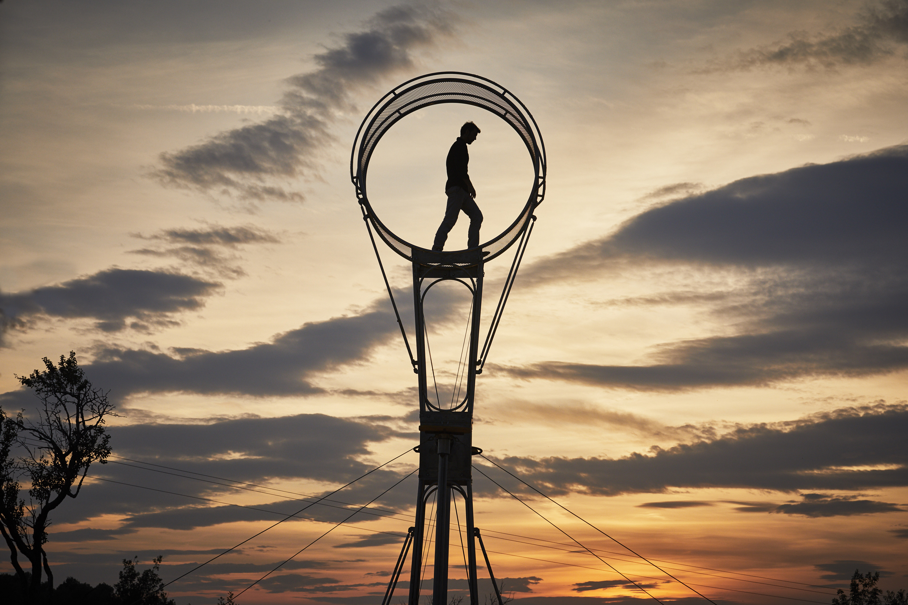 A roda gira. Convido as penas, convido a morte, convido o som de um western absurdo, convido a acreditar em algum sentido da feira da vida. Objeto mítico e raro do circo tradicional, a roda da morte é pelo seu tamanho e seu movimento circular, carregado de muitos símbolos. The wheel spins. I invite the feathers, I invite death, I invite the sound of an absurd western, I invite you to believe in some sense of the fair of life. The mythical and rare object of the traditional circus, the wheel of death is by its size and its circular movement, loaded with many symbols.