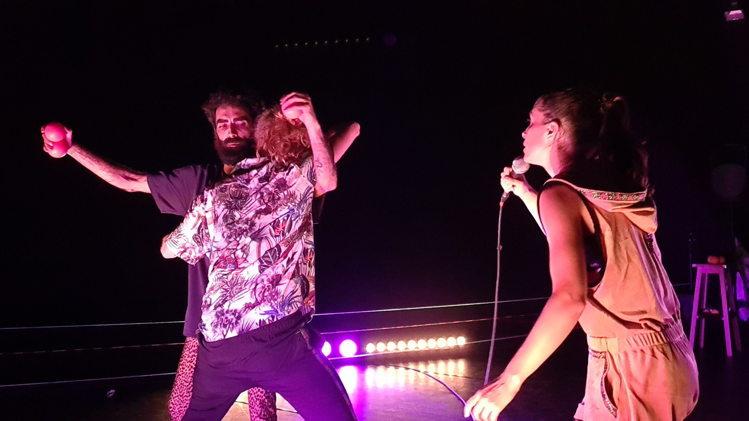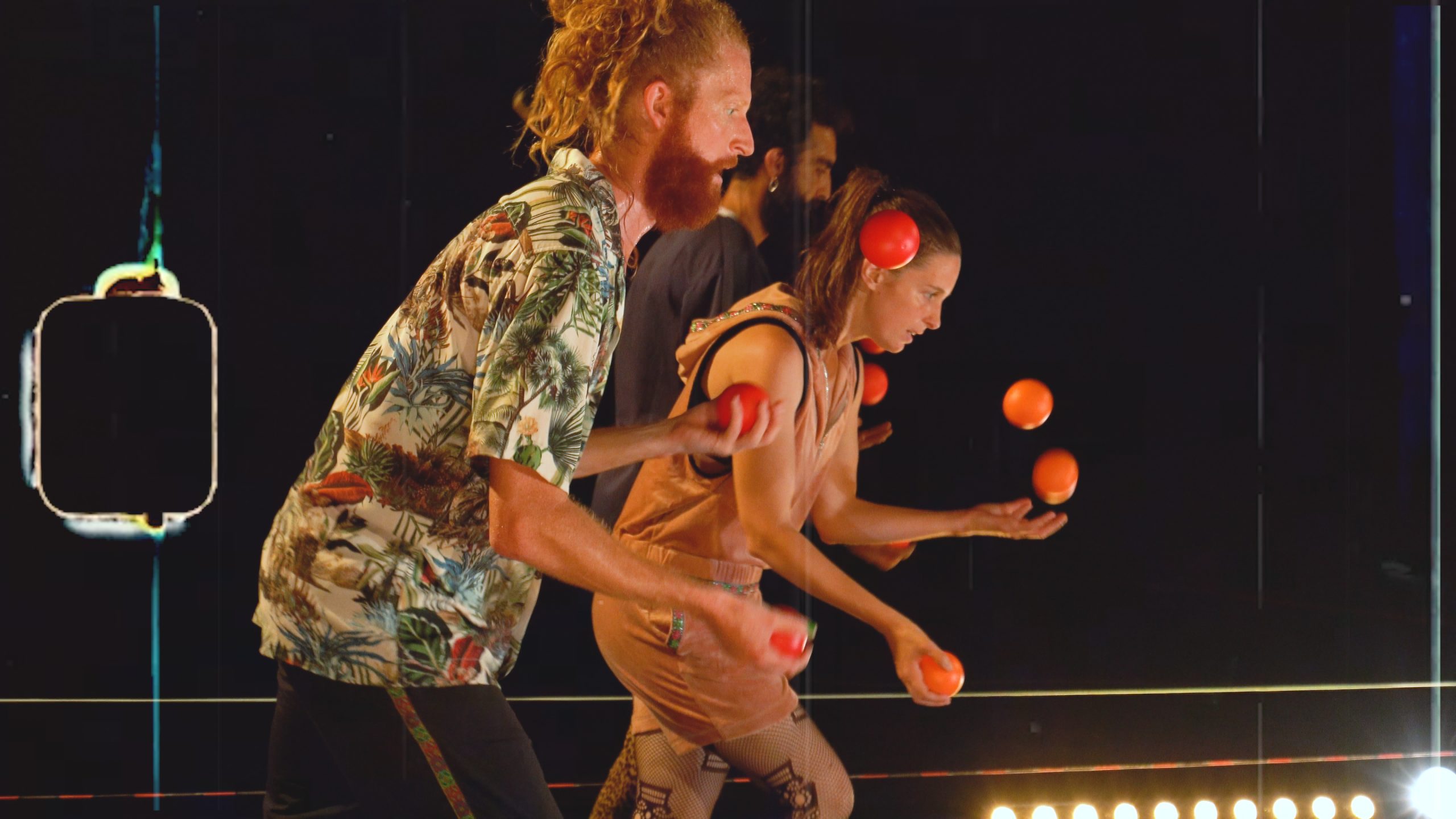 Guerreiros dançantes, manipuladores de armas invisíveis, sublimam a guerra numa batalha sem inimigos, num baile de defesa sem ataque. Rodeados de informação plástica e melodias dissonantes três malabaristas criam um bailado de objetos, corpos e ambientes numa composição baseada em repetições, sobreposições, avanços e recuos.