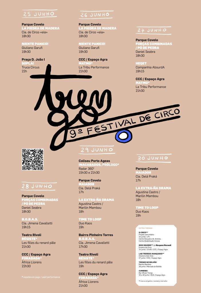 the 9th edition of the Trengo circus festival takes place on June 25th to 30th at Parque do Covelo, Teatro Rivoli, CCC | Espaço Agra, Praça D. João I, Coliseu Porto Ageas and Bairro Pinheiro Torres. It has 24 presentations of 13 shows and several extra activities.