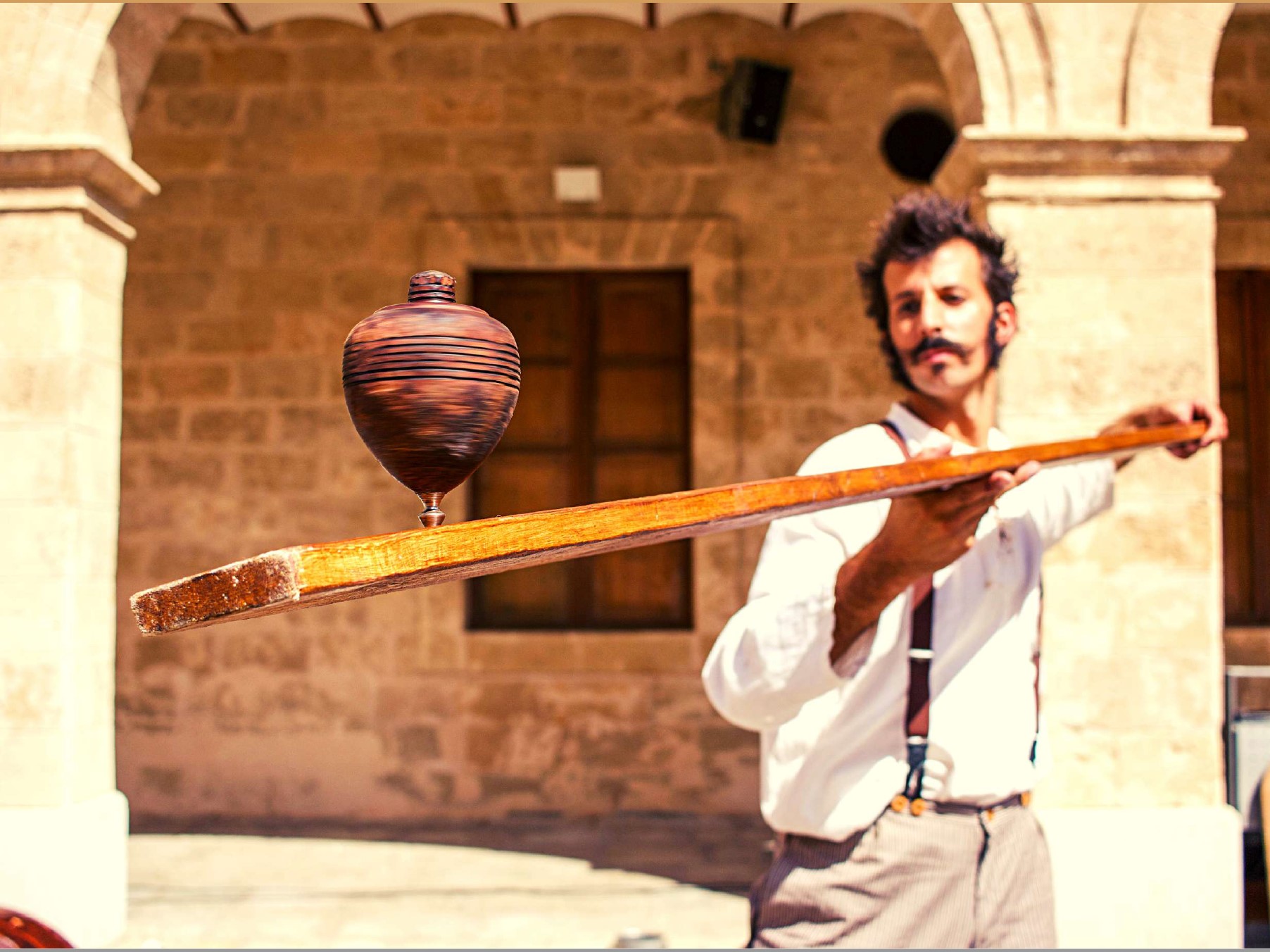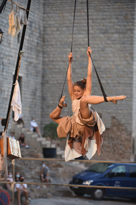 A character trapped since childhood by the gyroscopic effect of his spinning top. A journey of twists and turns that transports us to the game, one of the most important states of life. Fusing the circus arts with the popular game of the spinning top and the roots of Mediterranean culture is the main objective of this circus contemporary show.