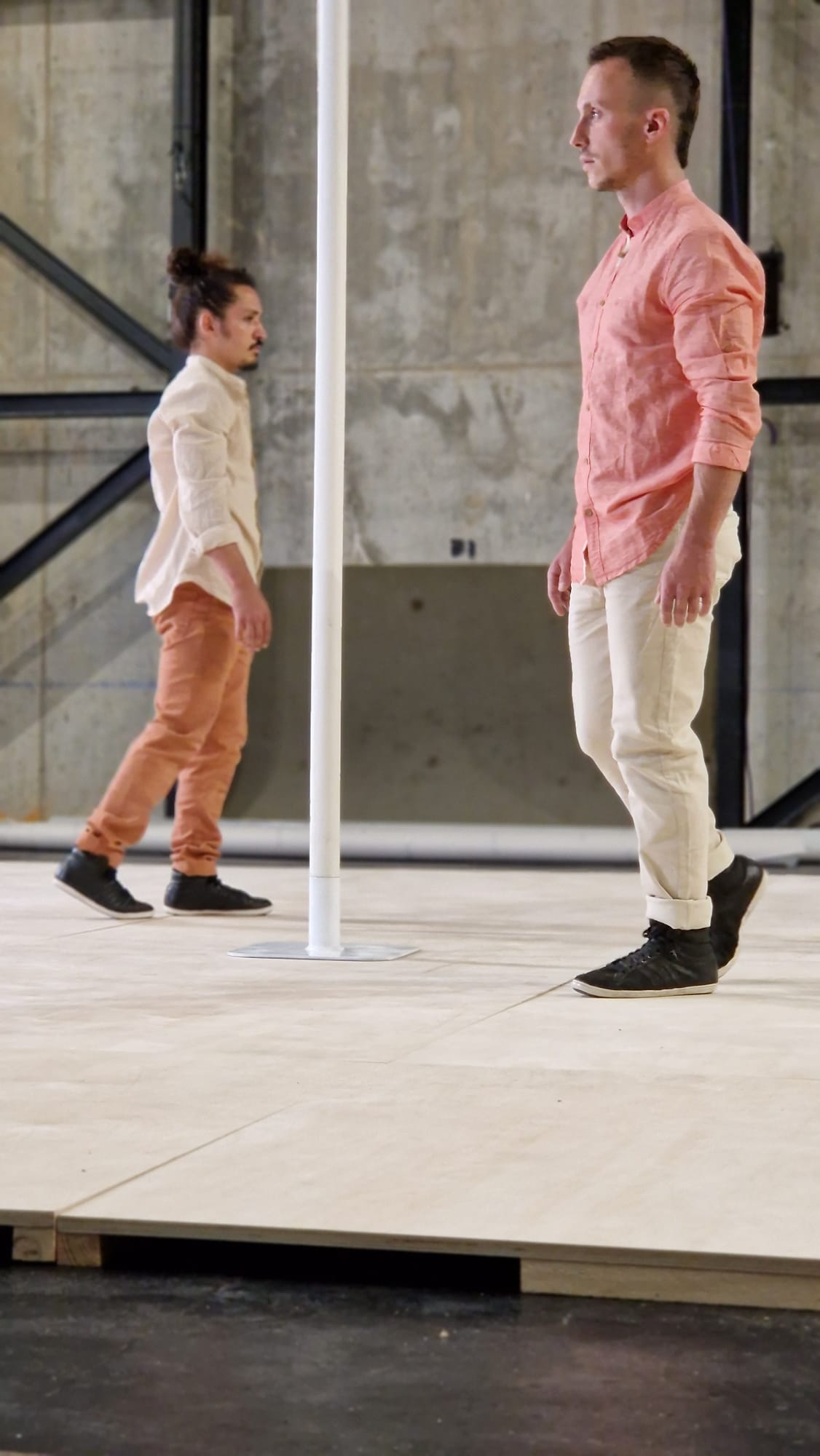 The silence is total, but inside me, a particular agitation reigns, contradictory information being processed in real time. The body says it can’t take it anymore, but the mind doesn’t care, pushing the body beyond its limit. In this second state the silence is deafer, and each movement that is made brings us closer to the limit. This is the starting point for this new creation, exploring the physical limit to tell what we see/feel on the other side, where the mental supports us and pushes us to reach a state we didn’t know before, revealing primary, intimate and universal emotions. The Chinese pole is the apparatus that will serve as a pretext to dive vertically into the depth of being, to reach that limit, and overcome it.
